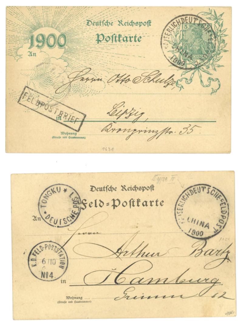 1900 a pair of German military postcards from Tangku, applied with "KAISERLICH DEUTSCHE FELDPOST / CHINA / 1900" ciruclar seal, showcasing Tongku German circular h.s. without date and "FELDPOSTBRIEF" h.s. respectively.