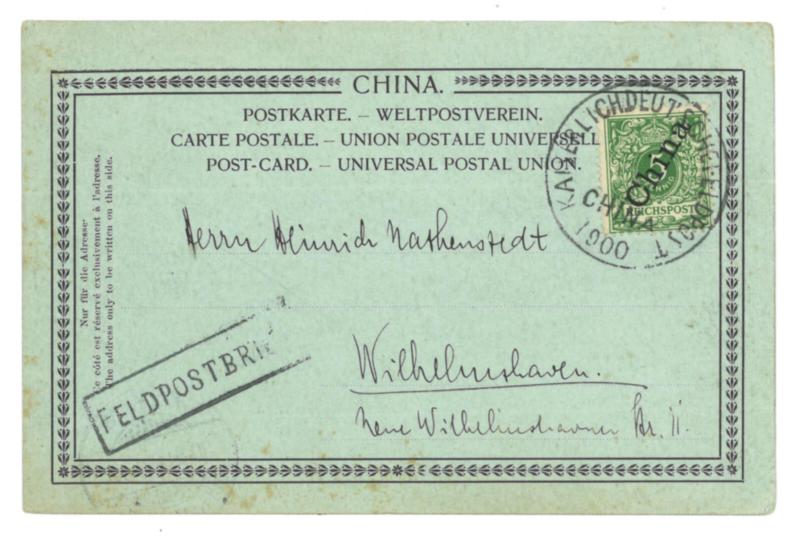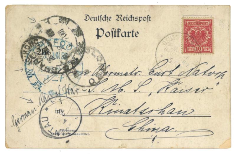 1900.9.2 德國軍郵明信片自德國戰艦Jaguar於大沽寄德國,鈐“KAISERLICH DEUTSCHE FELDPOST / CHINA / 1900”圓章。10.20抵威廉港。(Image 1)(Image 2)(Image 3)