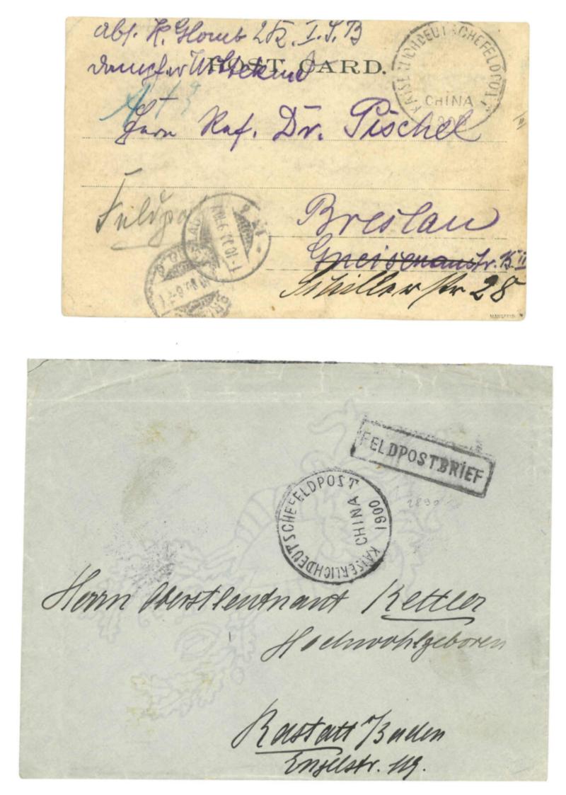 1900-1901 a group of about 14 German military postcards and covers from China, showcasing rare cancellations including Tangku“KAISERLICHE DEUTSCHE FELDPOST / CHINA / 1900” circular h.s. and Peking German PO type 6 provisional wooden cds, alongside with multiple unit seals.