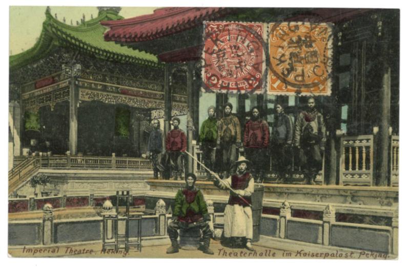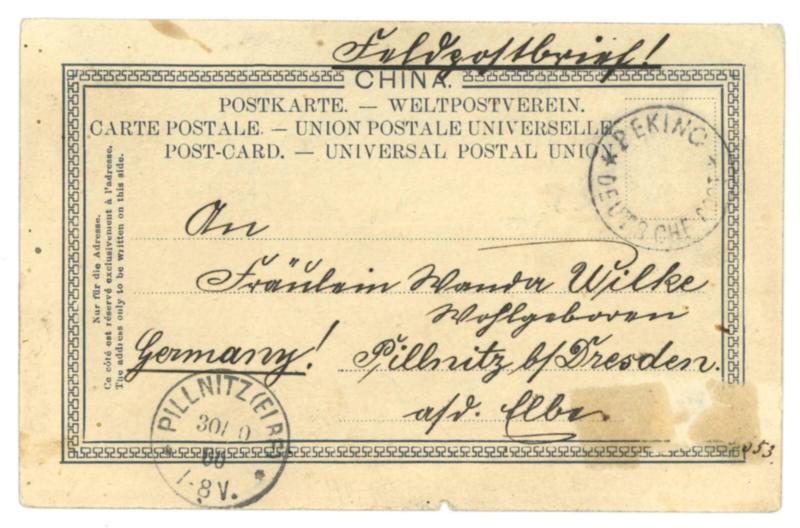 1900 Peking (12 Sep) to Germany. Picture postcard, applied with Peking German PO type 6 circular h.s. without date. Arrived Pillnitz (30 Oct). This scarce provisional wooden chop was only used between Sep and Nov 1900. With hand-painting on front.