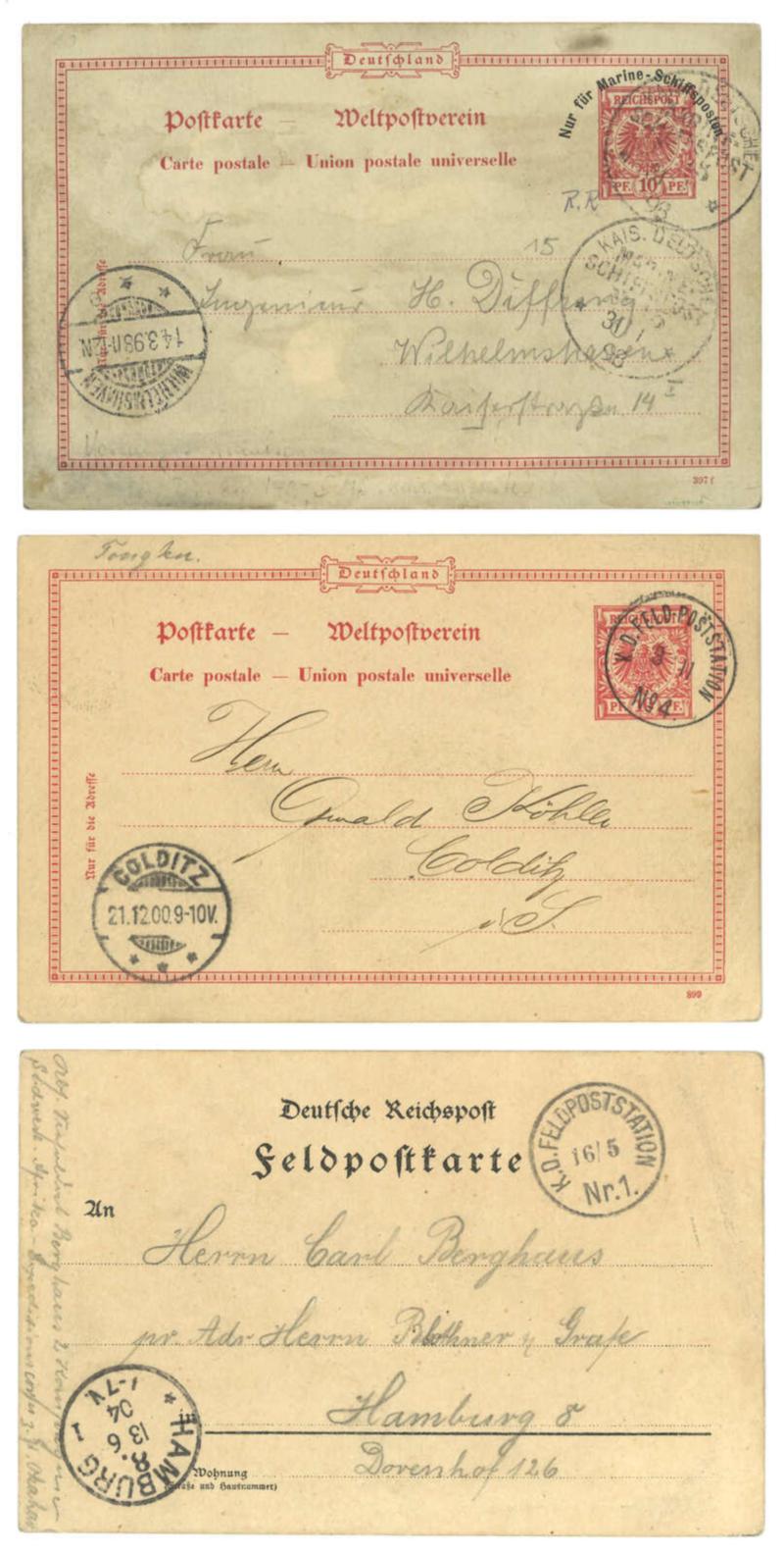 1898-1904 a group of 3 German stationery cards from KD Feld Post and Schiffspost No. 15 to Germany. Schiffspost No. 15 was set up on SMS Kaiserin Augusta.