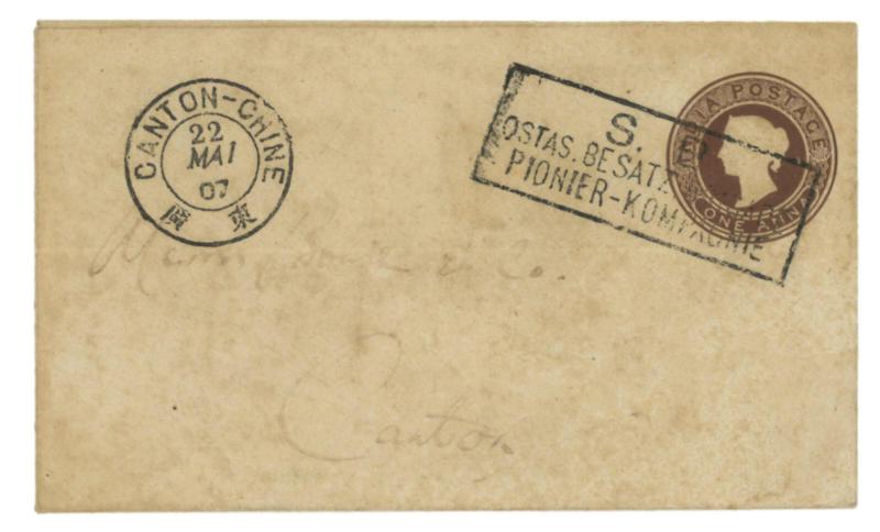 1907 Indian QV 1a stationery cover used by German troop in China, addressing to Canton. Indicia tied by "S.B. OSTAS. BESATZ / PIONIER - KOMPAGNIE" cachet. Arrived Canton French PO (22 May). German military usage of Indian stationery via French PO. Very interesting.