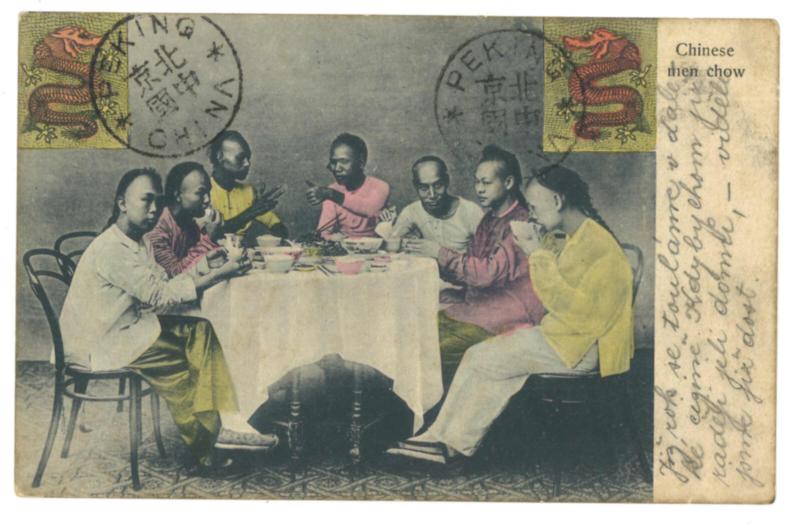 ca 1900 Peking to Germany. Picture postcard, f.w. Coiling Dragon 1c + 2c, tied by scarce "PEKING CHINA" bilingual circular d.s. On content side showing "K.BCCKCR.1.KOMP. / DEUTSCHE SCHUTZ / PEKING" seal in brown.
