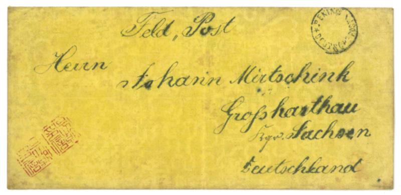 1900 Silk cover from Governor of Anhwei used by German military, applied with Peking German PO type 6 circular h.s. without h.s. Arrived Grossharthau (13 Dec). This scarce provisional wooden chop was only used between Sep and Nov 1900.