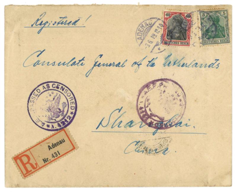 1919 Germany (3 Jun) to Consulate Genereal of the Netherlands, Shanghai. Registered cover, f.w. Germania 5pf + 50of, tied by Adenau cds., alongside with US A.E.F. A4212 censor mark. Transit Luxembourg (6 Jun). Arrived Shanghai German PO (24 Jul). Peculiar censor example.