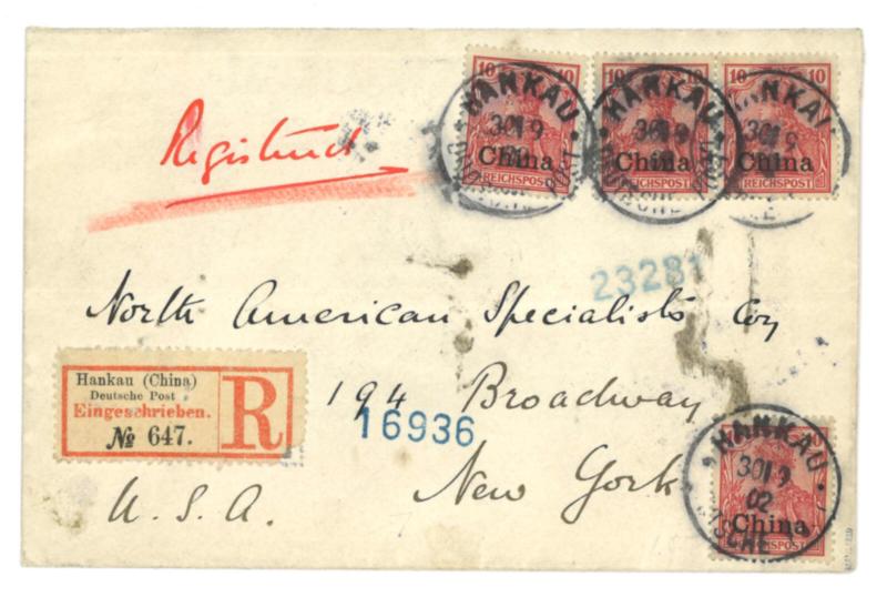 1902 Hankow (30 Sep) to USA. Registered cover, f.w. Germania ovpt China 4x 10pf, tied by Hankow German PO type 5 cds, alongside with registered label. Transit Yokohama (8 Oct). Arrived New York (31 Oct).