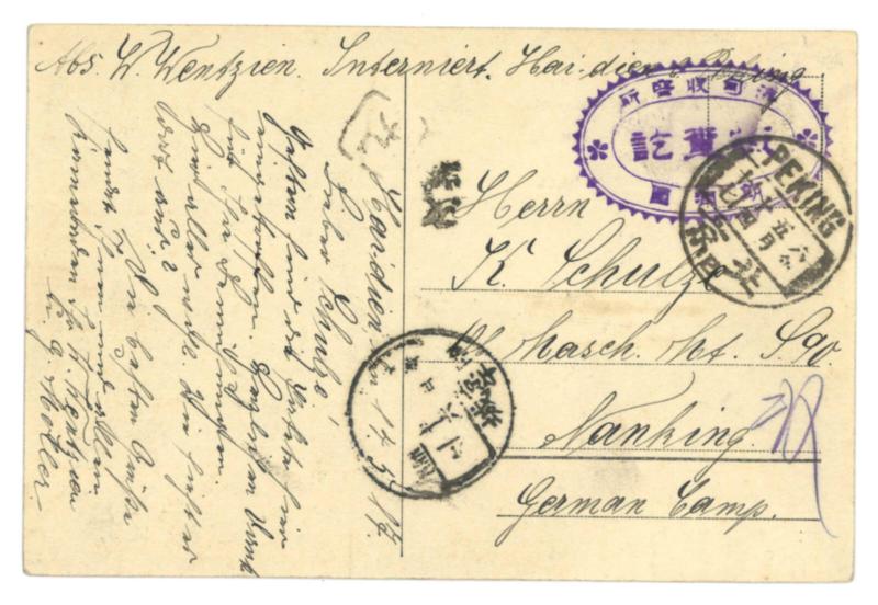 1917 Haitien POW camp (14 May) to Nanking POW camp. WWI POW picture postcard from the crew of SMS Vaterland, applied with oval Haitien POW camp censor mark in violet and Peking origin cds. Arrived Nanking (16 May). SMS Vaterland was taken over by Chinese Navy since China declared war to Germany.