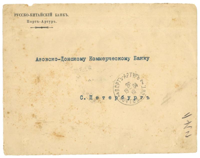 1904 Port Arthur (Jul) to St. Petersbug, detained during war, f.w. Coat of Arms 7k on reverse, tied by Port Arthur Russian PO type 2g cds. Detained by Japanese and sent to Russian Mission in Japan and redirected to Russia. Arrived St. Petersburg (11 Nov). Very rare detained example during Russo-Japanese War.
