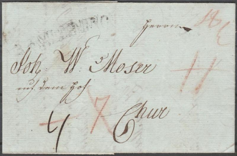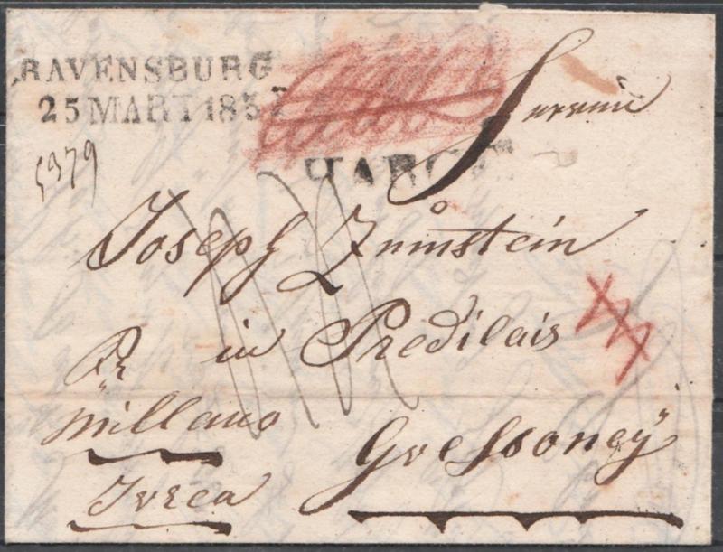 Germania Prefilateliche. 25/3/1832 - Lettera assicurata da Ravensburg (Prussia) per Milano - Ivrea a Gressoney (Ducato d’Aosta e Piemonte). SPL (Image)
