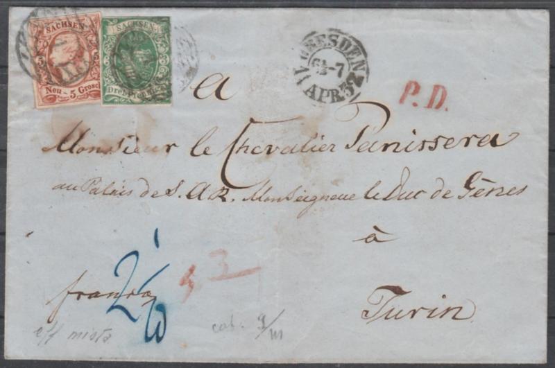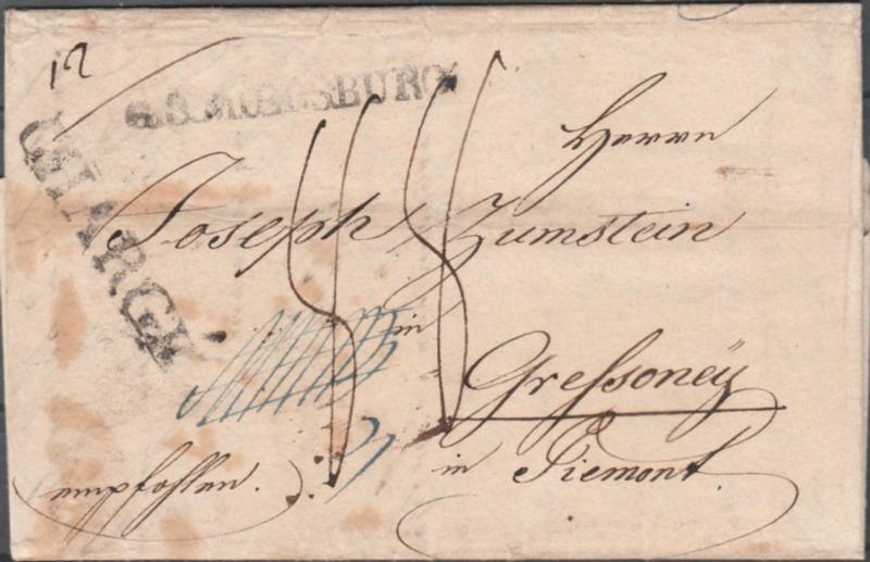 Germania Prefilateliche. 28/9/1833 - Lettera assicurata da Moersburg (Prussia) a Gressoney (Ducato d’Aosta e Piemonte). SPL (Image)