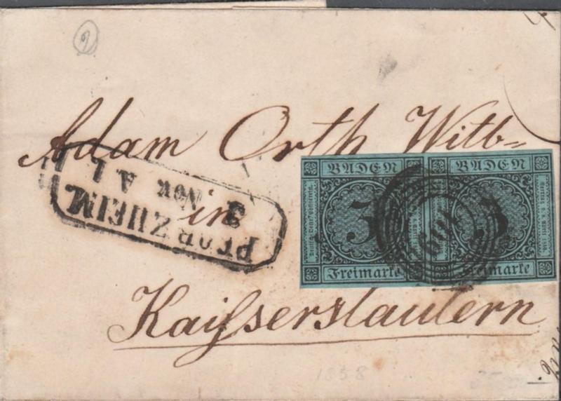 Germania Antichi Stati - Baden. 3/9/1858 - Lettera da Pforzheim diretta a Kaiserslautern, affrancata con una coppia orizzontale del 3 k. verde n. 6. Al verso annullo di arrivo. SPL (Image)