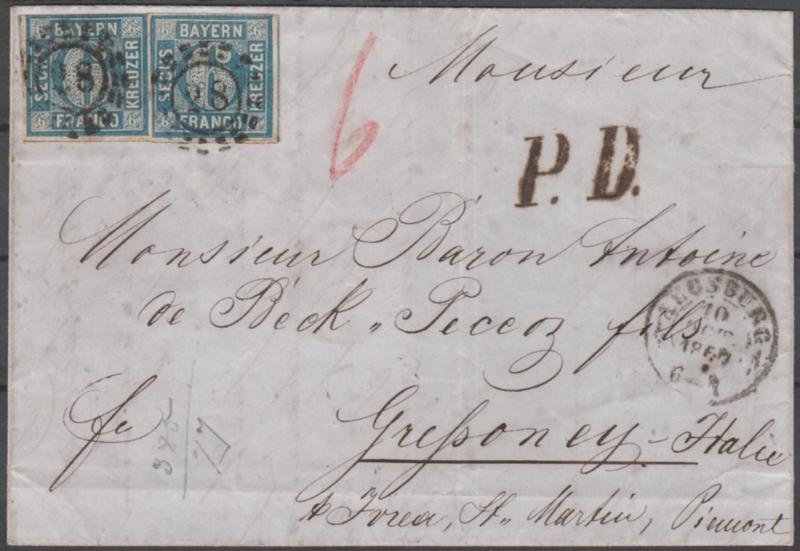 Baviera. 10.10.1867 - Involucro di lettera non completo diretto ad San Martin, Ivrea, affrancata con coppia orizzontale del 6 k. azzurro n. 11. Al verso transiti e arrivo. SPL (Image)