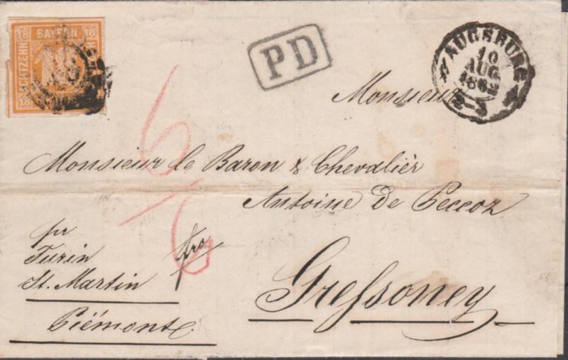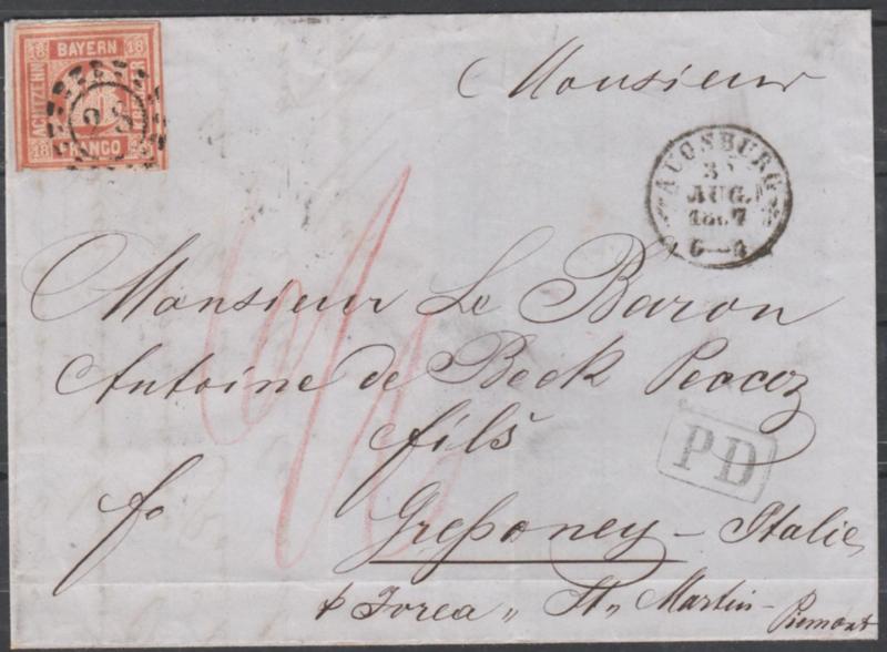 Baviera. 10.08.862 - Involucro di lettera non completo diretto ad San Martin, Ivrea, affrancata 18 k. ocra n. 11 il francobollo è toccato su 2 lati. Al verso transiti e arrivo. SPL (Image)