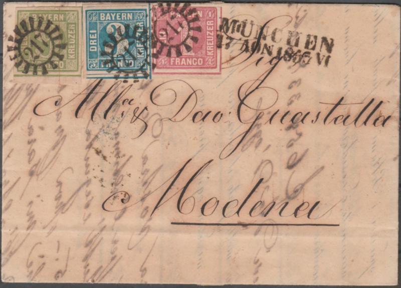 Baviera. 17.9.1855 - Lettera tricolore da Monaco diretta a Modena, affrancata con 3 k. azzurro + 1 k. rosa + 9 k verde giallo n. 2,4,6. Al verso transito Innsbruck. Molto bella. SPL (Image)
