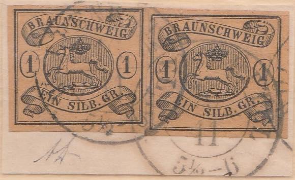 Brunswick. 1853 - Stemma, 1 s. nero su arancio n. 7b. 2 valori su frammento. Firmato A. Diena. Cat. € 1000,00. SPL (Image)
