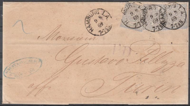 Germania del nord. 9/8/1869 - Lettera da Amburgo per Torino, affrancata con 3 francobolli 2 g. azzurro n. 16. SPL (Image)