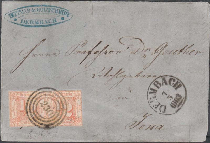 Thurn e Taxis. 1863 - Lettera da Dermbach per Jena, affrancata con coppia orizzontale del 1½ s. arancio n. 16. Al verso annullo di arrivo. SPL (Image)