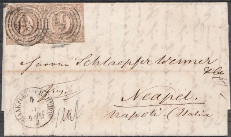 Thurn e Taxis. 3.5.1864 - Lettera da Francoforte a Napoli, affrancata con coppia orizzontale del 9 k. bistro n. 44. Al verso annulli di transito e arrivo. SPL (Image)