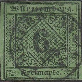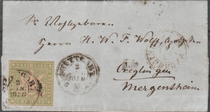 Württemberg. 2.1.1858 - Lettera da Stoccarda, affrancata con 6 k. verde n. 8. Annulli di transito e arrivo a Creglingen al verso. SPL (Image)