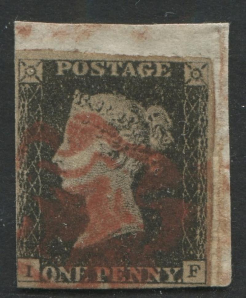 Great Britain 1840, #1 1d black (IF) on piece and cancelled with red MC, wiith just into (lower left to good margins, Scott value $375, appears f-vf (Image)