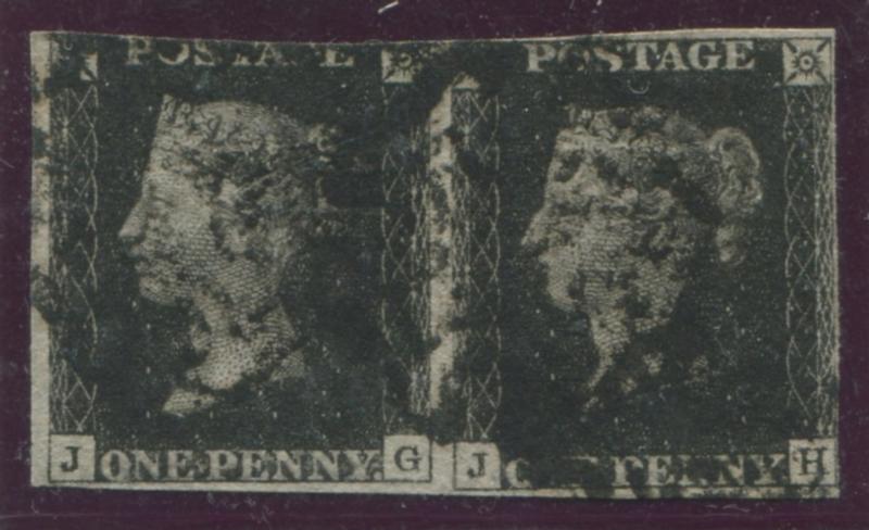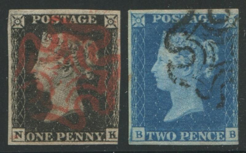Great Britain 1840 #1/#2 Postage Stamps. Cancelled F-VF. The world's first and second postage stamps issued. The # 1 one penny black is a nice 3 1/2 margin example, the #2 two pence blue is an attractive 3 margin with both stamps having nice eye appeal. S/C value of $1,375. (Image)
