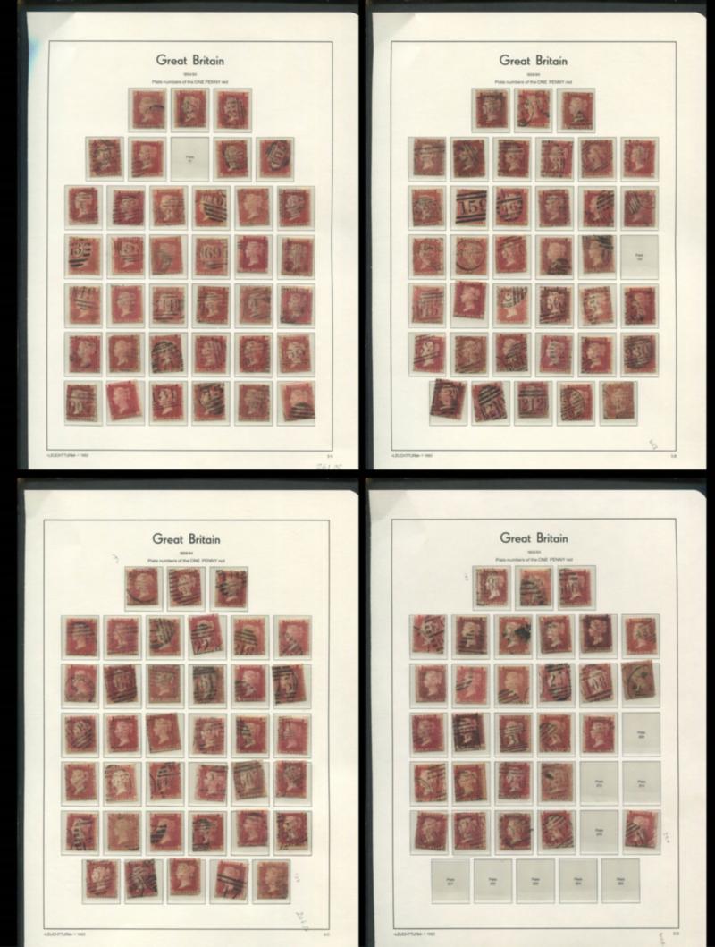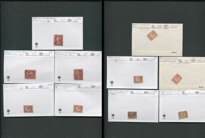 Great Britain 1860 - 1870, MH and used #32 1 1/2d dull rose, plate 3, used (3) and #58 1/2d plate 8 MH (2), plate 11 and 12, Scott value $1157 (Image)