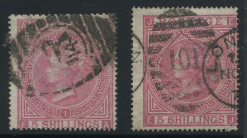 Great Britain 1867, #57 5/- rose, used with plates 1 FA and 2 EJ, Scott value $1200, appears f-vf (Image)