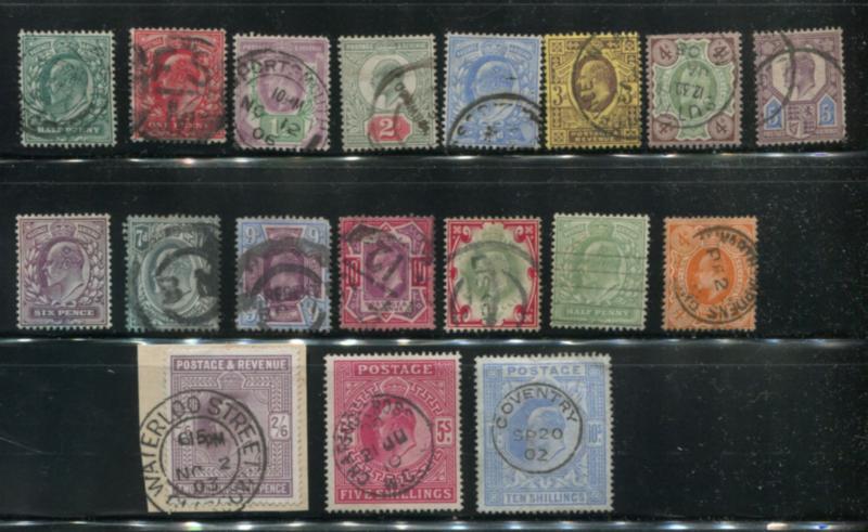 Great Britain 1902 -1911, #127 / #141 +#144/#145, a used group of ED VII 1/2d to 10/- on a stocksheet, Scott value $1279.5, appears f-vf (Image)