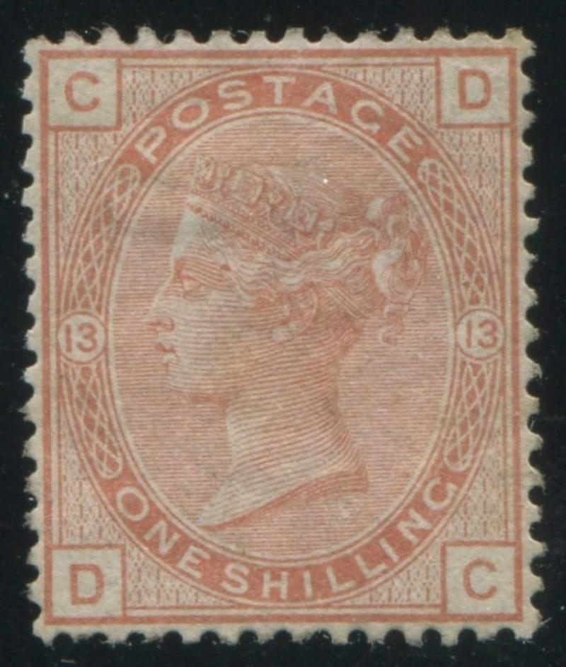 Great Britain 1873 - 1880, #65 a MH 1/- salmon plate 13, with part OG, has a 2015 APS Cert, has small corner thin and a spot across the forehead, otherwise appears f-vf (Image)