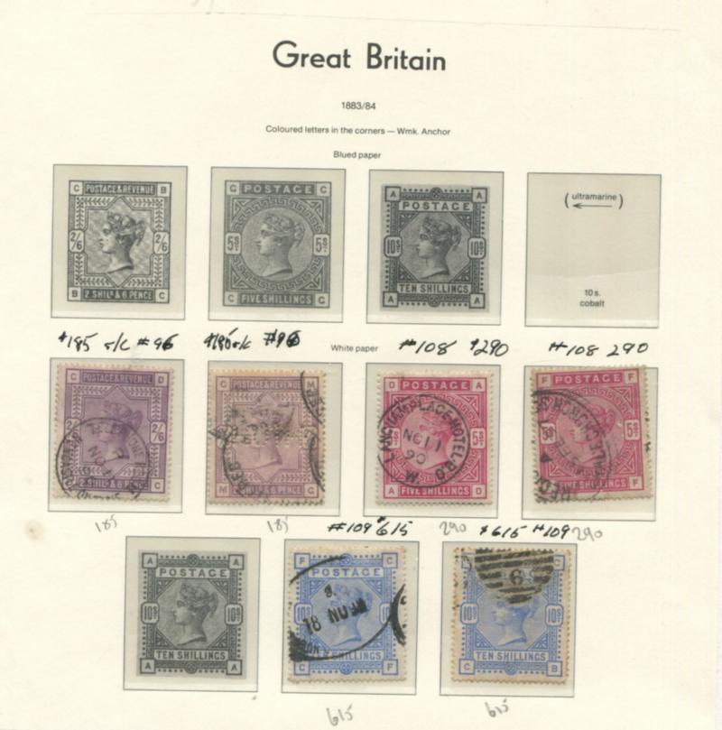 Great Britain 1883 -1884, #96 /#109, a used group of 2/6, 5/- and 10/-, with various cancels , Scott value $2180, appears f-vf (Image)