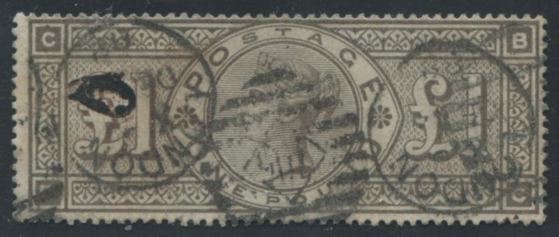 Great Britain 1888, #123 £1 brown violet on 3 Orbs watermark, Scott value $5250, appears f-vf (Image)