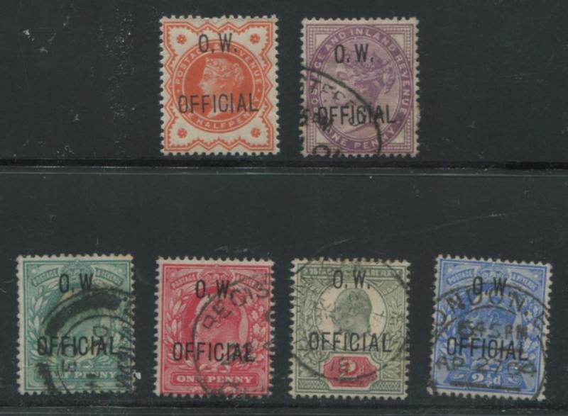 Great Britain - Officials Office of Works, 1896, #O44 / #O52, a MH and used of 6, Scott value $2225, appears f-vf (Image)