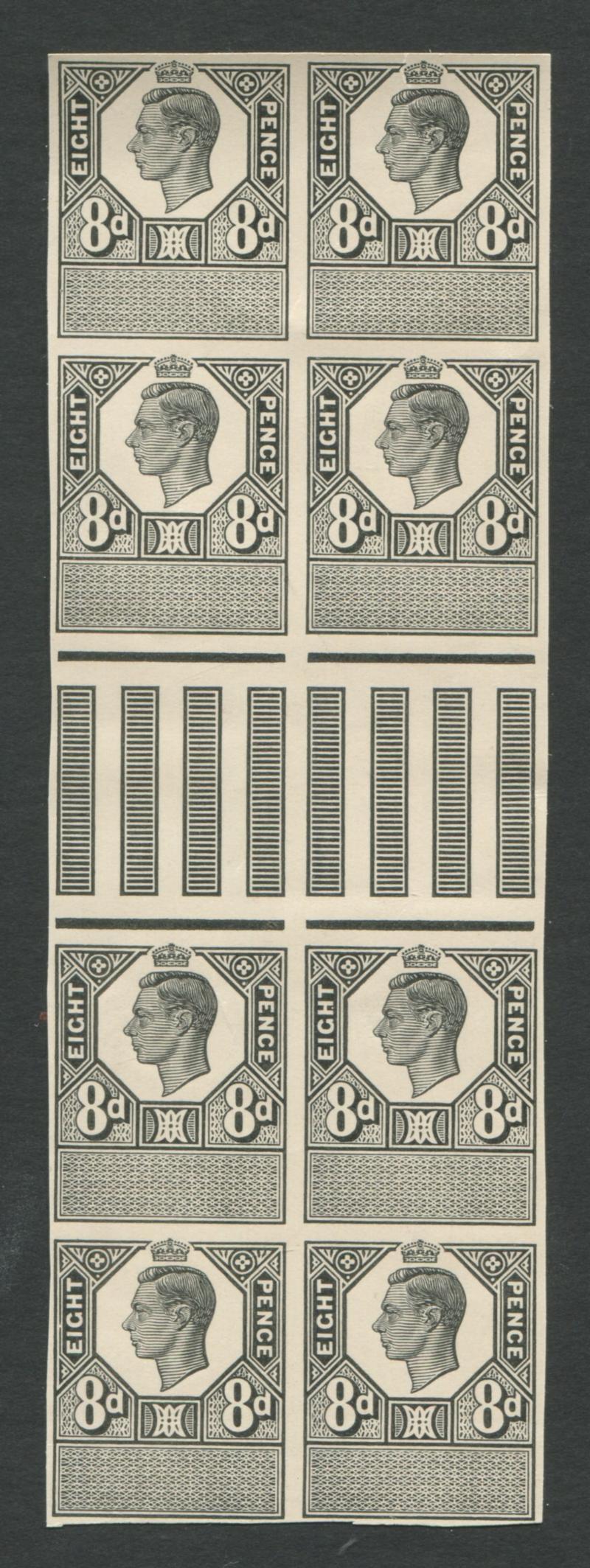 Great Britain 1937 - 1952?, a George VI 8d key plate proof in black in vertical gutter block of eight, likely would have been overprinted "Bankruptcy", appears f-vf (Image)