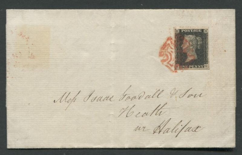 Great Britain 1840 1d black plate 5, four margin on Entire from Manchester to Halifax England, cancelled by orange-red maltese cross, dated 6 FEB 1841, SG value £775 on cover, appears f-vf (Image)