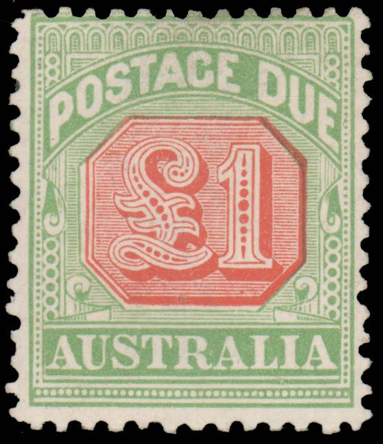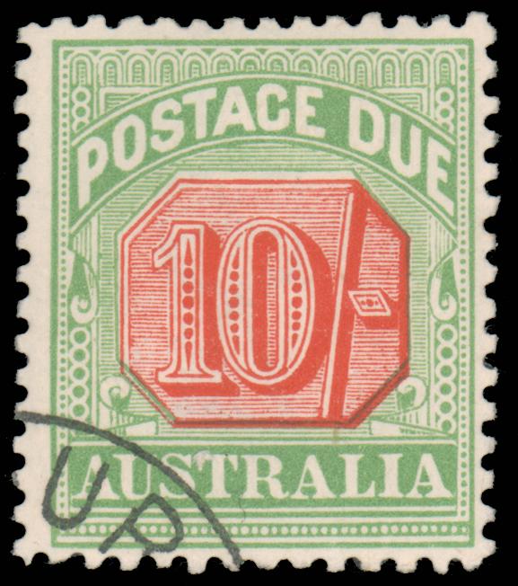 AUSTRALIA, 1909, 10sh GREEN & CARMINE PERF. 12x12½ POSTAGE DUE USED, #J48, fresh, small owner's backstamp, fine-very fine, cat. $170.00 (Image)