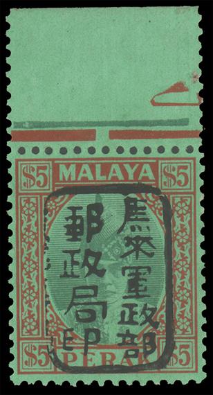 MALAYA - PERAK - JAPANESE ACCUPATION, 1942, $5 RED ON EMERALD BLACK OVERPRINT MINT, #N16, top margins single, lightly hinged, very fine, cat. $650.00, Gibbosn #J205 @ £600.00 (Image)