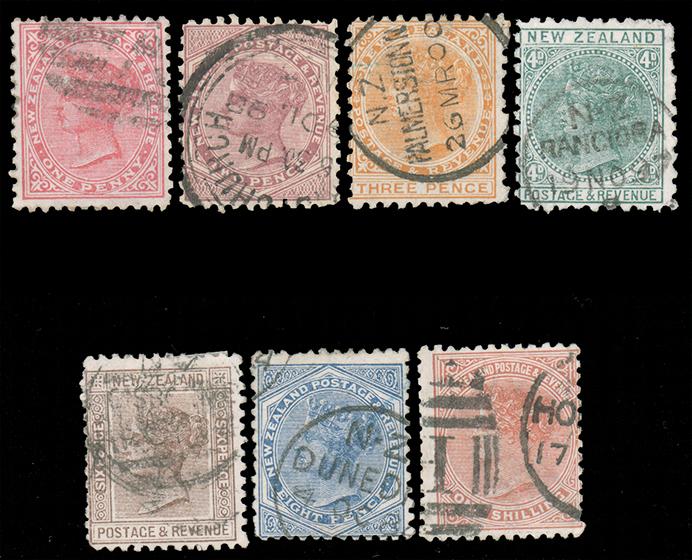 NEW ZEALAND, 1882-98, VICTORIA SET USED, #61-67, few short perfs, fine-very fine, cat. $103.25 (Image)