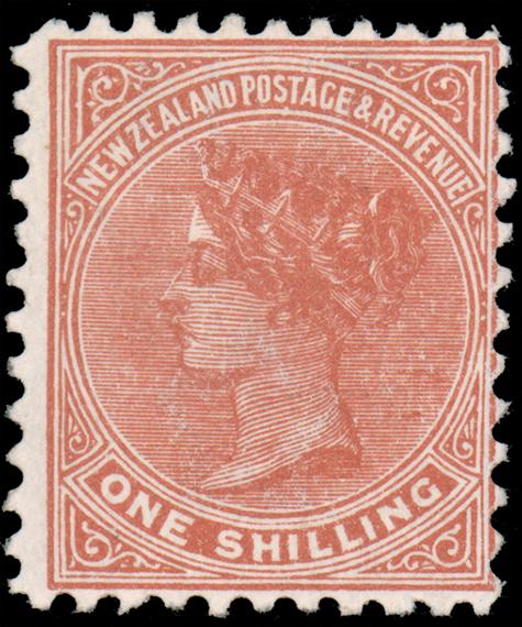 NEW ZEALAND, 1897, 1sh RED BROWN PERF 11 MINT, #67 var, h.r, fresh and fine-very fine, cat. Campbell Paterson #D10k @ $250.00 (Image)