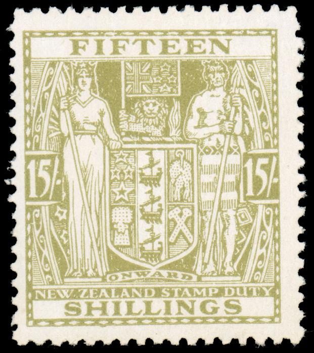 NEW ZEALAND, 1945, 15sh OLIVE FISCAL NH, #AR85, fresh and very fine, cat. $55.00 as hinged, Campbell Paterson #Z41c @ 250.00 NZD (Image)