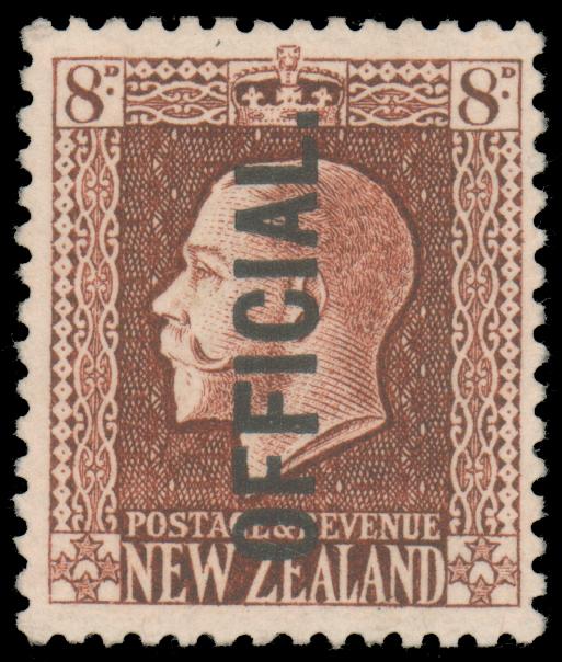 NEW ZEALAND, 1922, 8p RED BROWN OFFICIAL MINT, #O51, large h.r, fresh and fine-very fine, cat. $125.00, Campbell Paterson #KO10d @ 225.00 NZD (Image)