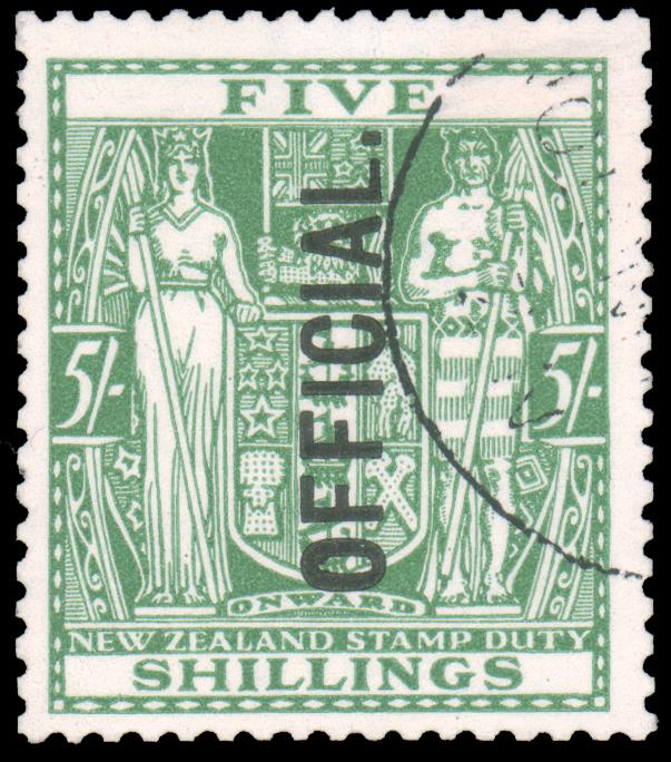 NEW ZEALAND, 1933, 5sh GREEN OFFICIAL USED, #O57, fresh and very fine, cat. $450.00 (Image)