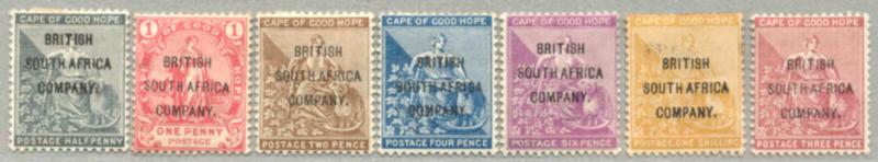 1896, 1/2d. - 1s., full set of (7), perf. 14, Cape of Good Hope stamps opt with BRITISH SOUTH AFRICA COMPANY. in black, 1s with kiss of double opt, POG, interesting and desirable, F-VF! Schätzpreis 400€. (Image)