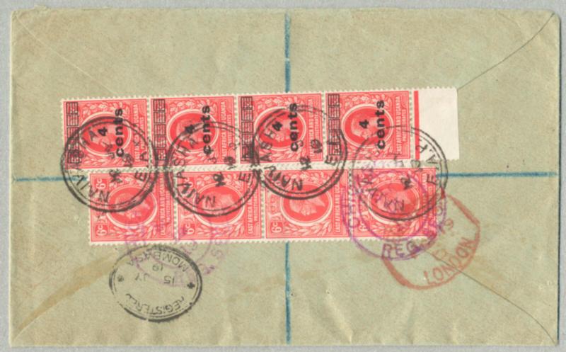 1919, 6c (4) + 4c on 6c (4), both as vert strips of (4), all stamps on reverse, on registered letter from NAIVASHA via MOMBASA via LONDON to CHICAGO, cancelled NAIVASHA 12 JY 19 and with transit red LONDON, oval black REGISTERED MOMBASA and lilac CHICAGO REG. SEC., front with company arrival cachet and lilac REGISTERED over R label with m/s NAIVASHA, the surcharge was invented to be used alongside normal 6c stamps to make up the new 10 cents Empire rate introduced in 1919 - but examples - or in this case strips - used together in this way on commercial covers are rare, very interesting letter, fresh and desirable, XF! Schätzpreis 1.200€. (Image)