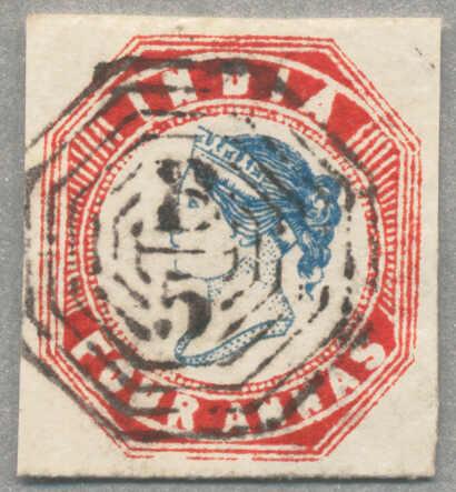1854-55, 4a, blue and red, Indian stamp used in Burma, wmk part of Coat of Arms, imperf, 4th printing, Head III, Frame II, Pos.8, used with octagonal cancel B/5 of AKYAB/Burma, very good margins, cert BPA, fresh and desirable, VF-XF! Schätzpreis 4.000€. (Image)