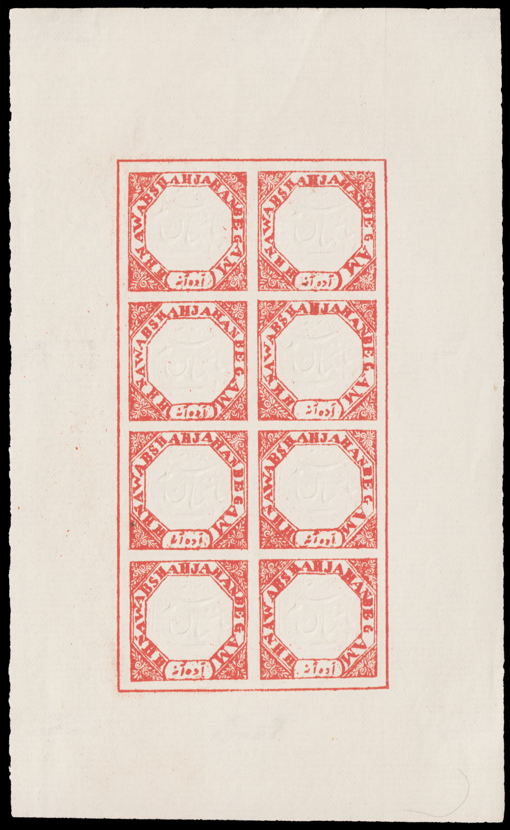 1895 BHOPAL Mi:18B, SG:47 red ½a on laid paper full sheet of 8, wmked on margins. $0 (Image)