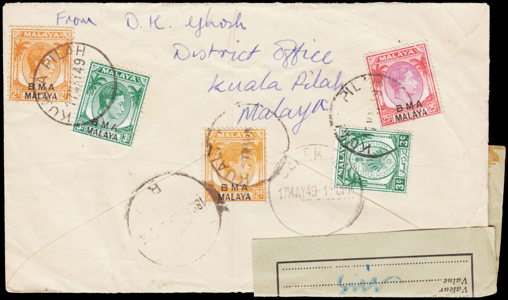 1949 Registered cover franked with Malaya and Straits Settlements stamps with BMA opt, sent from Kuala Pilah to Sweden, with Malaya Customs label and green Swedish Customs oval chop alongside. $0 (Image)
