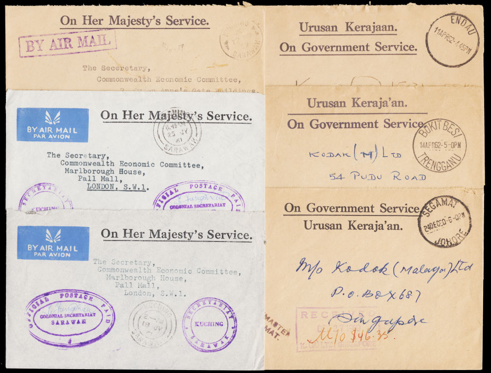 1900´s - 1950´s 40 covers sent abroad (6 On Her Majesty´s Service covers), most to England, franked with Malaya States stamps, some few covers are damaged. $0 (Image)