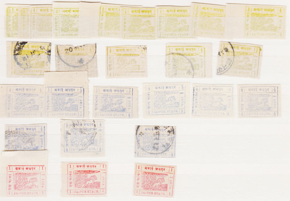 JAIPUR Album with stamps from 1904 to 1946 incl. Official stamps, mostly used, many with duplicates, plus one domestic used postcard and one 1/4 A double pre-stamped card. $0 (Image)