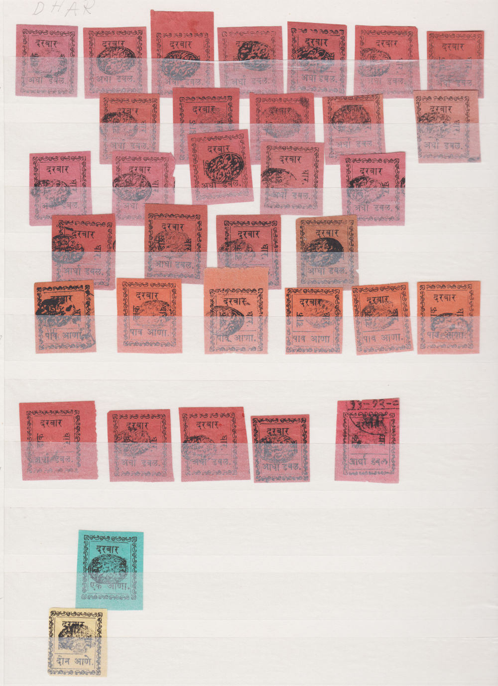 DHAR Two album pages with unused stamps from 1897 to 1900 with duplicates, incl. a sheet o f 10 stamps of ½p black/red. $0 (Image)