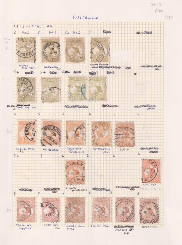 Australia 1913-33 GV Heads duplicated range of 90, on 3 Hagner pages. Noted 1d SG 21cw (invtd wmk), 4d 22b, 22c; 2d 78, 78a; 1d 83; 1½d 84, 1½d 97, 2d 98 (x 2), 5d 103a, 5d on 4½d 120. SG cat approx £270. Almost all used (mostly FU).